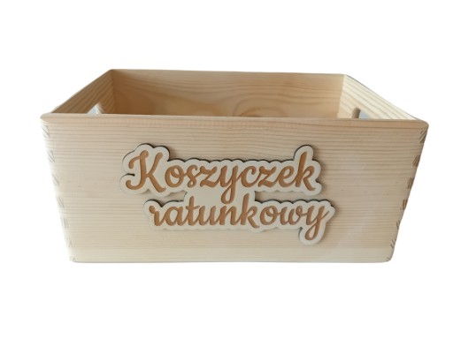 Koszyczek drewniany naturalny z naklejonym napisem: