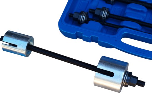 Zestaw służy do montażu i demontażu łożysk w zwrotnicach oraz tulejek zawieszenia. W zestawie prasa śrubowa i adaptery. Wszystko w eleganckiej walizce.