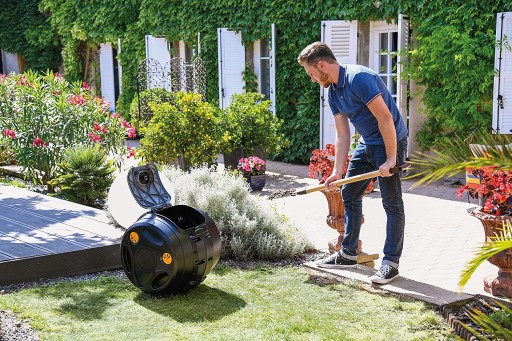 - Dzięki systemowi "Tumble" proces kompostowania jest znacznie przyspieszony, od 6 miesięcy ze standardowym kompostownikiem do zaledwie 2 miesięcy. Bęben jest wyposażony w szeroki i zamykany otwór (27,5 cm), który został specjalnie dopasowany do rozmiaru łopatki, aby łatwo usunąć kompost z bębna. Naklejki na luce wyraźnie wyjaśniają, jakie rodzaje odpadów mogą dostać się do bębna i jak używać kompostownika