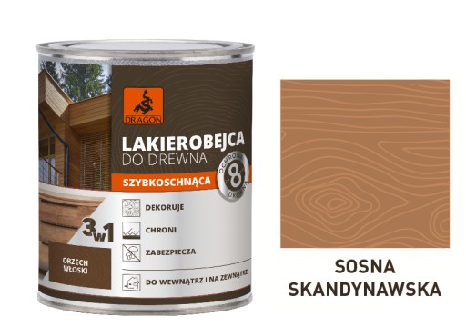 Szybkoschnaca Lakierobejca Dragon to wysokiej jakości produkt ochronno – dekoracyjny do zabezpieczenia drewna zarówno wewnątrz pomieszczeń jak i na zewnatrz. Dzięki zaawansowanej formule 3 w 1 idealnie sprawdzi sie jako produkt, który impregnuje drewno, nadaje kolor i chroni na lata.