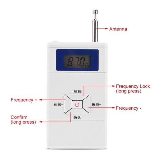 Praca w pełnym paśmie, częstotliwość z zakresu 70 MHz ~ 108 MHz można dowolnie ustawić.