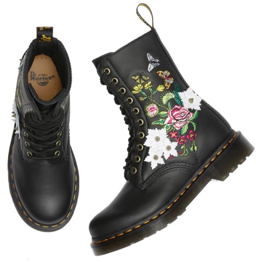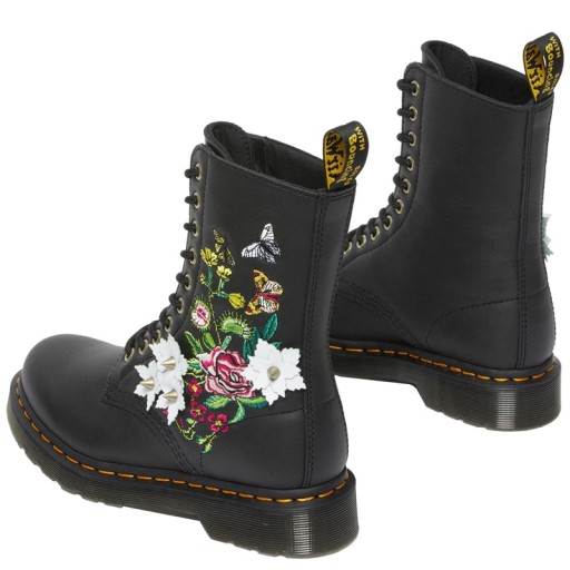 Klasyczne trzewiki z kolekcji obuwia Dr. Martens. Sznurowane na dziesięć dziurek. Wykonane z naturalnej skóry licowej w kolorze czarnym. Cholewka ozdobiona haftowanym wzorem w postaci motywów z dzikiego, kolorowego ogrodu (rosiczki, róża, drobne kwiatuszki, motyle) dodatkowo urozmaiconym białymi, przestrzennymi kwiatami. Podeszwa doszywana do wierzchu buta przy pomocy słynnej, żółtej nici (technologia Goodyear Welted). W podeszwie umieszczona charakterystyczna dla martensów tzw. poduszka powietrzna.