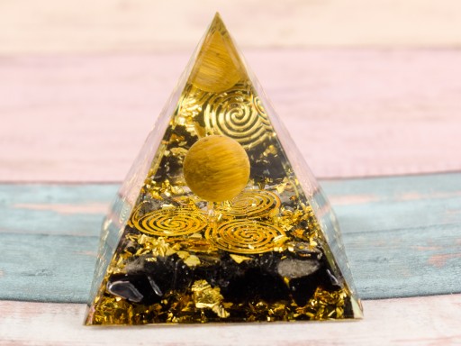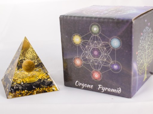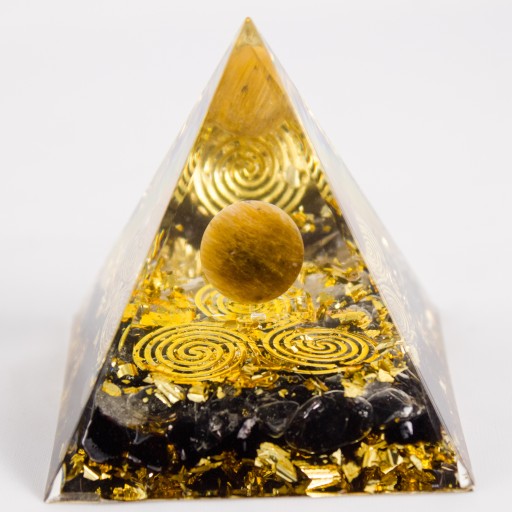 Piękna Piramidka Orgonitowa – Kula z Tygrysiego Oka, śliczna dekoracja z miedzią, Kryształem, Kwarcem Dymnym i złotymi kawałkami folii, dodająca energii i ochrony całego organizmu, a także ochrony przed toksycznymi ludźmi.