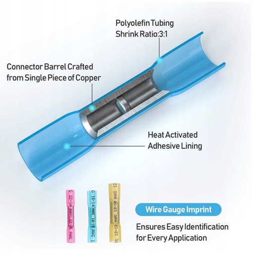 SPECYFIKACJA TECHNICZNA: Typ: Mufa zaciskowa w izolacji termokurczliwej Przekrój żyły: AWG24-22, AWG22-16,AWG16-14, AWG12-10 Materiał styków: Miedź Cynowana Materiał izolacji: PE Grubość materiału przewodzącego[mm]: 1 Kolor izolacji: kolorowy Rodzaj opakowania: blister Ilość w opakowaniu: 300