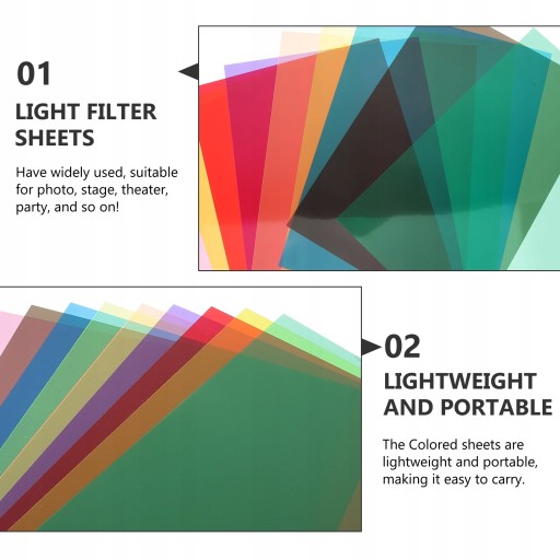Opis Materiały PVC o niezawodnym wykonaniu, ten lekki zestaw arkuszy filtracyjnych jest trwały przez cały okres eksploatacji. Kolorowe arkusze filtrów mają szeroki zakres zastosowań, odpowiednie do filmów, wideo, scen, teatrów, zdjęć, imprez, dobre do lamp błyskowych LED w studio fotograficznym.