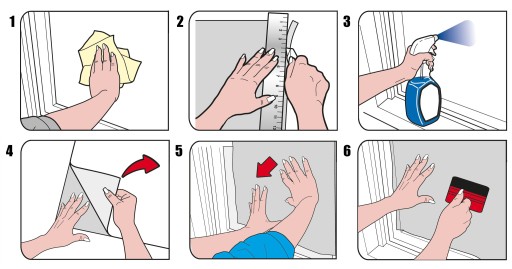 Folia powinna być montowana „na mokro”, tzn. przy użyciu wody z kilkoma kroplami płynu do mycia naczyń (2-3 krople na litr wody). Do jej równomiernego rozprowadzania może służyć spryskiwacz.