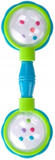 Grzechotka SZTANGA sprawdzi się jako pierwsza zabawka dla maluszka, ponieważ jest lekka i poręczna. Dziecku łatwo chwycić ją w rączkach. Zabawka posiada obrotowe elementy. Ma delikatnie zaokrąglone kształty. Przezroczyste części zabawki zawierają małe, kolorowe elementy, które poruszają się podczas zabawy i wywołują przyjemny dźwięk grzechotania. Zachęca dziecko do ćwiczeń i zabawy, stymulując jego rozwój psychomotoryczny.