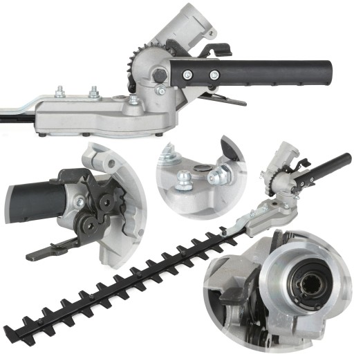 Nożyce do żywopłotu\przystawka do kosy spalinowej pozwala w łatwy i szybki sposób przerobić podkaszarkę spalinową na nożyce do żywopłotu na wysięgniku. Urządzenie doskonale sprawdzi się podczas przycinania wysokiego żywopłotu i drzewek ozdobnych. Przystawka wyposażona w stopniową regulację kąta nachylenia nożyc.