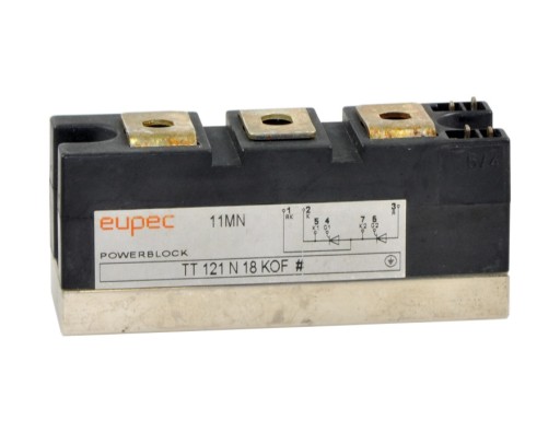 Nowe, nigdy nie używane podwójne moduły tyrystorowe renomowanej firmy EUPEC o symbolu: TT 121 N 18 KOF. Pochodzą z zapasów magazynowych firmy, nigdy nie były stosowane. Mają świetne parametry napięciowe i prądowe.