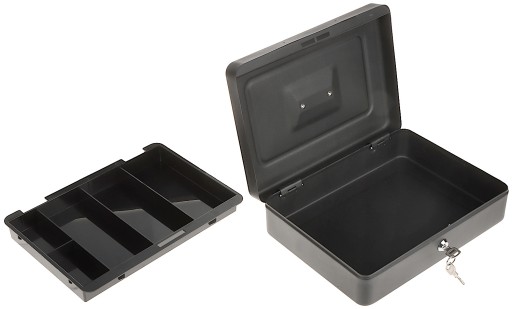 Zamykana na klucz, metalowa kaseta BOX-300 pozwala na podstawowe zabezpieczenie niewielkich kwot pieniędzy, dokumentów lub innych niewielkich, wartościowych przedmiotów. Skrzynka posiada wyjmowaną plastikową tackę z przegrodami, pod którą znajduje się dodatkowa przestrzeń.