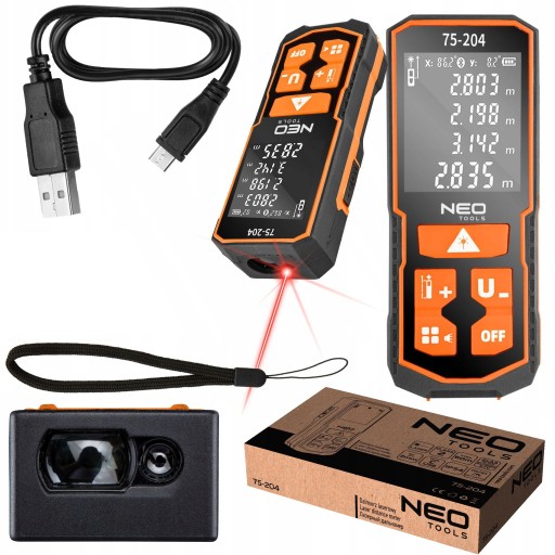 Dalmierz laserowy NEO (nr ref. 75-204) o zasięgu maksymalnym 60 m to urządzenie służące do pomiaru odległości, pola powierzchni oraz objętości. Funkcje dalmierza pozwalają również na pomiary pośrednie (przy pomocy twierdzenia Pitagorasa), pomiary ciągłe, dodawanie i odejmowanie, pomiary maksymalny i minimalny. Pomiaru można dokonywać od początku, środka i końca urządzenia oraz w trzech jednostkach miary: m/in/ft. Dodatkowo urządzenie wyposażone zostało w automatyczną poziomnicę pozwalającą na bieżąco odczytywać kąt położenia dalmierza. Posiada pamięć ostatnich 30 pomiarów. Dokładność pomiaru wynosi +/- 2 mm. Urządzenie posiada klasę szczelności IP54 i certyfikat CE. Dalmierz wyposażony został w regulowaną głośność. Zasilany jest dwoma akumulatorami AA NI-MH lub dwoma bateriami alkalicznymi typu AA. W zestawie znajduje się kabel do ładowania USB typu C i opaska na nadgarstek.