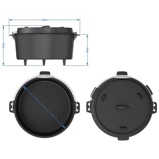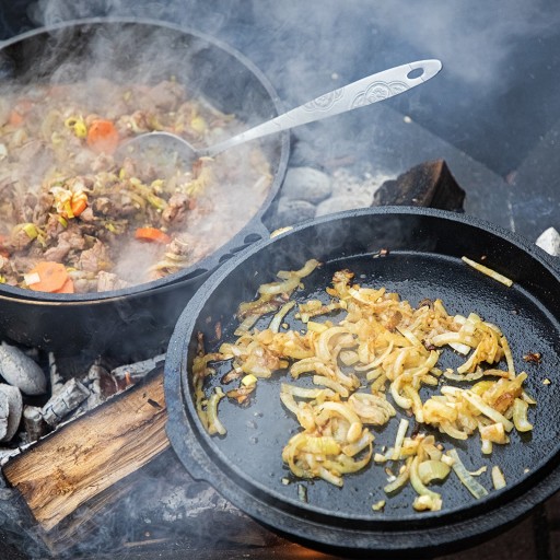 - Idealne gotowanie i smażenie nad ogniem - kociołek o sporej pojemności (9 L) z opcją użycia pokrywki (3 L) jako patelni to świetna alternatywa dla grilla w gronie rodziny czy przyjaciół. Daje możliwość gotowania pysznych i aromatycznych dań jednogarnkowych oraz smażenia na patelni.
