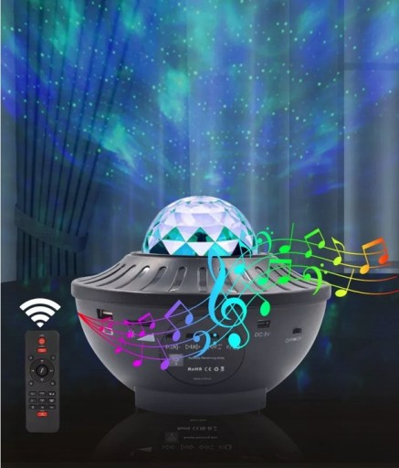 - Urządzenie przede wszystkim zachwyca niesamowitymi projekcjami we wszystkich kolorach tęczy ale nie tylko, posiada również wysokiej jakości nagłośnienie. Produkt ma wbudowany głośnik, i odtwarza muzykę z zewnętrznych dysków ze złączem USB, bądź przez Bluetooth z urządzeniem mobilnym.