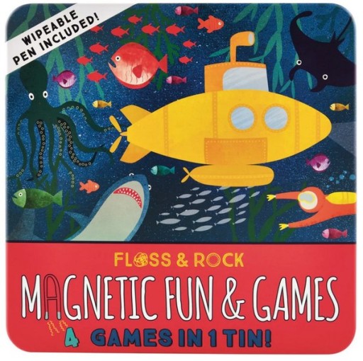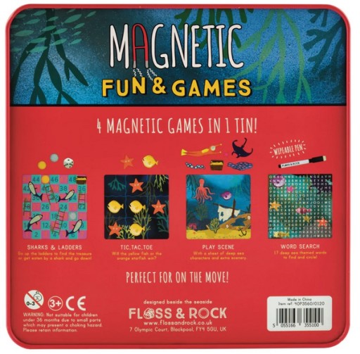 Zestaw czterech popularnych gier i zabaw magnetycznych w jednym pudełku dla młodszych, jak i starszych. Ciesz się graniem i zabawą z przyjaciółmi i rodziną lub w pojedynkę. Zestaw zawiera: grę rekiny i drabiny, grę kółko i krzyżyk (rybki i rozgwiazdy), planszę do zabawy logicznej w wyszukiwanie słów oraz planszę z zabawnymi postaciami z głębin morskich do kreatywnej zabawy. Wszystkie plansze i elementy są magnetyczne. W zestawie znajduje się woreczek do przechowywania wszystkich drobiazgów oraz długopis do wyszukiwania słów i wycierania na sucho. Całość zapakowana jest w atrakcyjne metalowe, poręczne pudełko, dzięki czemu zestaw idealnie sprawdzi się w podróży i do zabawy na świeżym powietrzu.