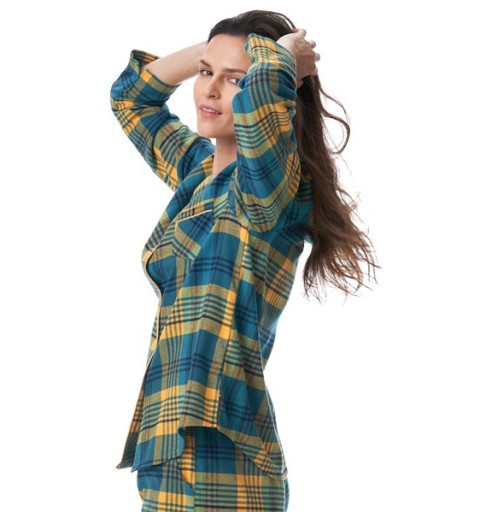 Piżama damska z naturalnej bawełnianej flaneli, we wzorze w kobiecą kratkę. Koszula rozpinana w całości na guziki, z eleganckim kołnierzykiem. Rękawy długie, na wysokości piersi mała kieszonka. W komplecie długie spodnie o prostej nogawce, po bokach kieszenie. Piżamka ciepła, miękka i przyjemna w dotyku. Dzięki naturalnej bawełnie, posiada właściwości higroskopijne.