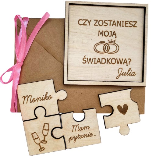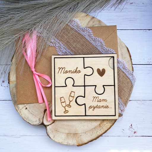 - Drewniane 4 puzzle przedstawiające ozdobną grafikę, napis "Mam pytanie" oraz spersonalizowany napis (imię przyszłej Świadkowej) np. "Moniko/Monika" itd.