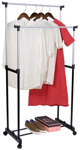 Nasz wieszak stojący na kółkach MIA jest idealnym rozwiązaniem do każdego domu i biura, gdzie brakuje miejsca do przechowywania odzieży. Nasz produkt posiada podwójny drążek, który łatwo można regulować za pomocą zacisków, oraz kółka umożliwiające wygodne przemieszczanie. Dodatkowym atutem wieszaka jest wytrzymała i pojemna półka na buty, a także nakładki na końcach drążka, które zapobiegają zsunięciu się odzieży.