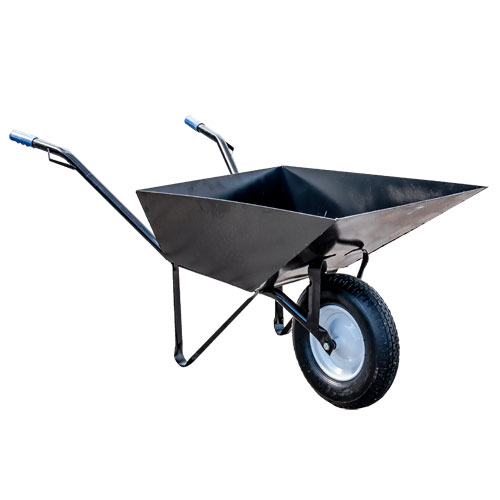 Wysokiej jakości solidna i trwała taczka o pojemności 90 litrów z tłoczonej blachy malowanej proszkowo na kolor, solidnej stalowej obręczy z dodatkowym podparciem misy i jedną oponą pneumatyczną z łożyskiem kulkowym na stalowej feldze.