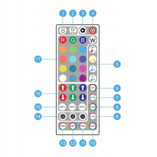 Kontroler podłączony do listwy RGB pozwoli nam na jej włączanie i wyłączanie, zmienianie kolorów świecenia listwy, ustawienie 8 różnych kolorów świecenia oraz 4 tryby (programy) zmiany kolorów by znaleźć najodpowiedniejszy w zależności od naszego nastroju.