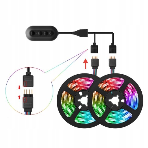 ?Reagowanie w rytm muzyki?: Nasze sterowniki łatwo wykrywają każdy dźwięk dzięki wbudowanemu wysokiej czułości mikrofonowi. Twoja taśma po włączeniu odpowiedniego trybu zacznie zmieniać kolory zgodnie z rytmem głosu i muzyki. Muzykę możesz również odtwarzać z aplikacji mobilnej, bądź z głośników niepodłączonych w żaden sposób do taśmy! Dźwięk rozchodzi się po domu, a taśma reaguje!