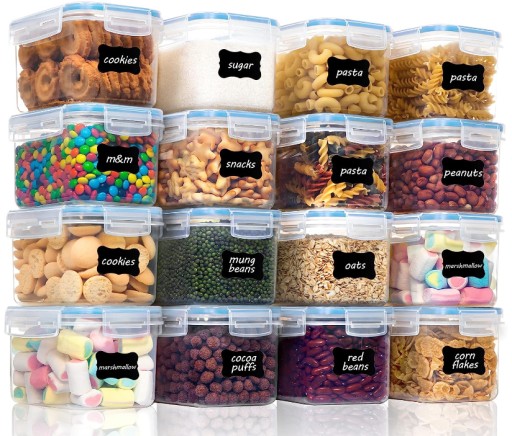 Vtopmart Zestaw pojemników na żywność 0,8 l, pojemnik na musli i pojemniki na żywność, tworzywo sztuczne bez BPA, szczelne, pojemniki na żywność, zestaw 16 sztuk, 24 etykiety na zboża, mąkę, cukier itp. (niebieskie)