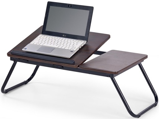 Regulowany stolik pod laptopa B19 firmy Halmar. Stelaż wykonany ze stali malowanej proszkowo na kolor czarny. Blat wykonany z płyty MDF okleinowanej w kolorze ciemny orzech. Nóżki składane. Regulowany kąt nachylenia lewej części blatu (4 pozycje) za pomocą mechanizmu zapadkowego. Prawa część blatu nieregulowana. Na lewej (większej) części blatu znajduje się ogranicznik zabezpieczający przed zsuwaniem się laptopa.