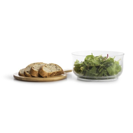 Zestaw do serwowania - szklana miska sałatkowa i bambusowa deska.