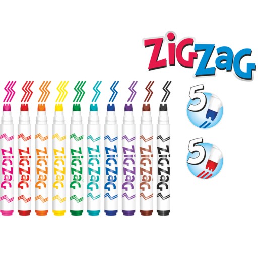 Flamastry ZIG ZAG w 10 kolorach, z dwiema różnymi końcówkami do rysowania jednocześnie dwóch lub trzech linii. Idealne do ozdabiania zaproszeń, kartek okolicznościowych i laurek.