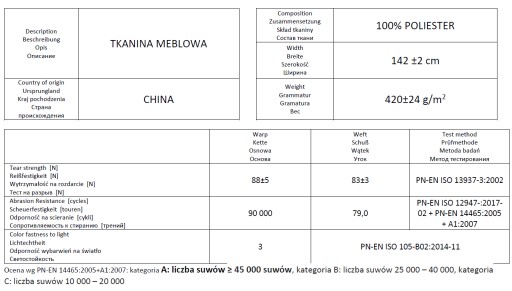 Przedstawiamy specyfikację tkaniny (szczegółowa karta techniczna znajduje się w załączniku):