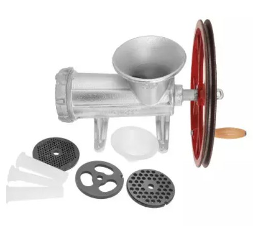 Wysokiej klasy ręczna maszynka do mielenia mięsa. Produkt renomowanej marki Rossler. Ta wersja maszynki przystosowana jest zarówno pod silnik elektryczny jak i do napędu ręcznego. Ważną częścią maszynki jest dopasowana ślimacznica osadzona na łożysku, która wprawiona w powolny ruch obrotowy (napędzana ręcznie korbą/kołem lub za pomocą silnika) przesuwa kawałki mięsa w kierunku obracających się wraz ze ślimacznicą noży rozdrabniających mięso przeciskane przez tarczę z niewielkimi otworkami o ostrych krawędziach.