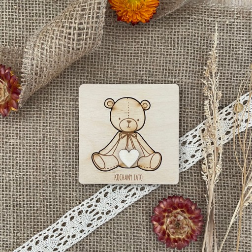 ❤️ Drewniana kartka ma wygrawerowanego misia oraz napis: KOCHANY TATO.