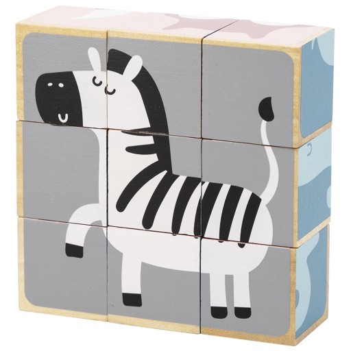 - 9 drewnianych klocków, z których można ułożyć obrazki