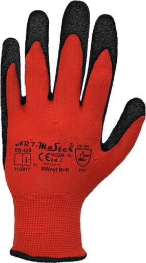 Rękawice robocze, powlekane lateksem w kolorze czerwono - czarnym. Dobrze dopasowują się do dłoni. Szorstka powłoka lateksowa zapewnia zręczność i pewny chwyt trzymanych przedmiotów oraz zmniejsza wnikanie brudu.