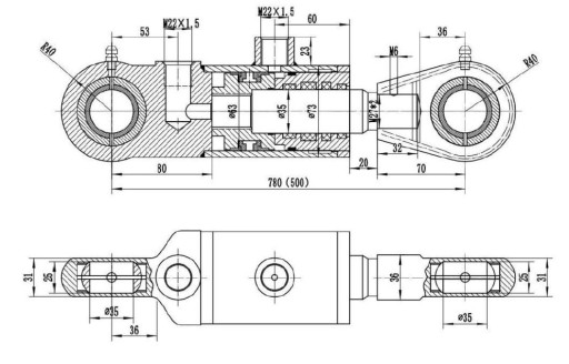 - Długość złożonego siłownika: 780 mm
