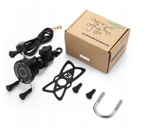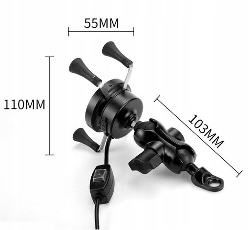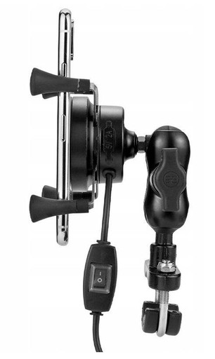 Uchwyt doposażony w niezależne gniazdo USB (5V 2A). Przyda się do ładowania telefonu, nawigacji interkomu motocyklowego, mp3, etc. Gniazdo USB dodatkowo posiada wyłącznik, dzięki któremu w każdej chwili możemy wyłączyć źródło ładowania. Ponadto zabezpieczone jest gumową „zatyczką” chroniącą go przed zalaniem.