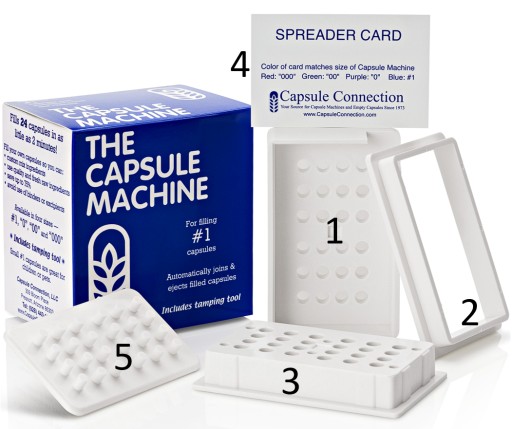 Podręczna kapsułkarka, umożliwiająca samodzielne pakowanie kapsułek żelatynowych i celulozowych. Jednorazowo można napełnić 24 kapsułki, co zajmuje około 5-10 minut.