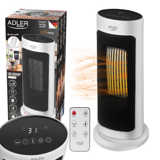 Termowentylator z wydajną grzałką ceramiczną, wyświetlaczem LED i pilotem zdalnego sterowania. Urządzenie posiada programator czasowy umożliwiający ustawienie czasu pracy od 1 do 12 godzin. Wyświetlacz LCD wskazuje wybraną temperaturę w przedziale 15-40°C, aktywację wybranych funkcji. Termowentylator grzeje z mocą 1400W lub 2000W, posiada funkcję oscylacji poziomej w zakresie 50°, wyłącznik bezpieczeństwa automatycznie odcinający zasilanie w przypadku przewrócenia urządzenia, zabezpieczenie przed przegrzaniem oraz uchwyt dla wygody przenoszenia. Urządzenie wyposażone jest w pilot zdalnego sterowania.