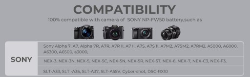 Sony Alpha 7, A7, Alpha 7R, A7R, A7R II, A7 II, A7S, A7S II, A7M2, A7SM2, A7RM2, A5000, A6000, A6300, A6500, a3000, NEX-3, NEX-3N, NEX-5, NEX-5C, NEX-5N, NEX-5R, NEX-5T, NEX-6, NEX-7, NEX-C3, NEX-F3, SLT-A33, SLT-A35, SLT-A37, SLT-A55V, Cyber-shot, DSC-RX10