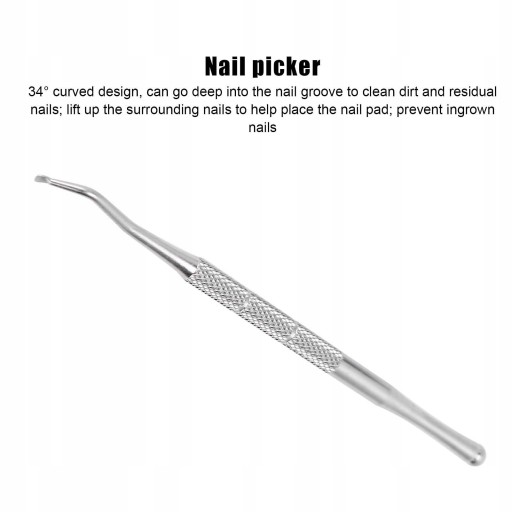 Zbieraczka do paznokci: zakrzywiona konstrukcja 34 °, może wejść głęboko w rowek gwoździa, aby wyczyścić brud i resztki paznokci; podnieś otaczające paznokcie, aby pomóc umieścić podkładkę do paznokci; zapobiegają wrastaniu paznokci.