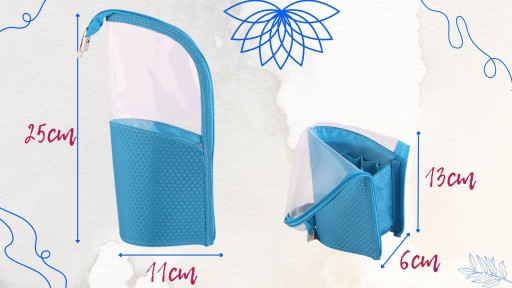 - ✅ usztywniane dno i elastyczny panel przezroczysty- dzieki temu kosmetyczka może pełnić funkcję stojaka