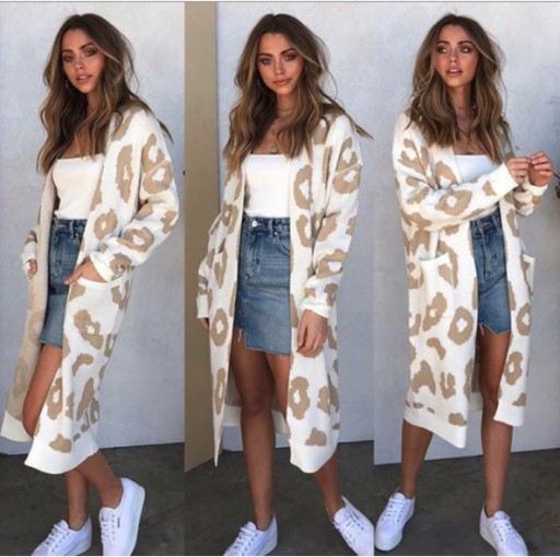 SWETER DAMSKI KARDIGAN DŁUGI PANTERKA BEŻOWY