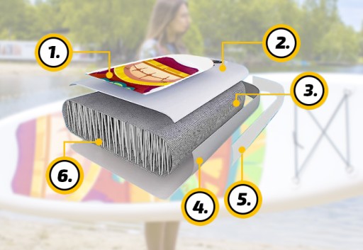 6️⃣ WŁÓKNA DROPSTITCH miliony gęsto tkanych włókien dzięki, którym deska zachowuje swoje właściwości podczas dużych i niskich temperatur