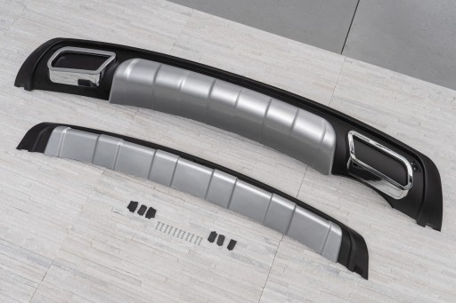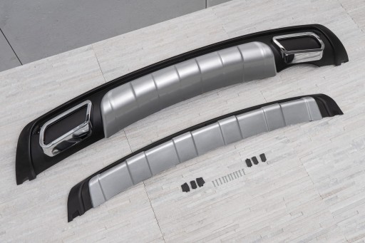Zestaw zawiera dwie dokładki: na przód i tył samochodu. Osłony wykonane są z wysokiej jakości tworzywa ABS pokrytego lakierem w kolorze czarnym oraz srebrnym o wyglądzie aluminium. Wkomponowane w tylną dokładkę zostały dodatkowe imitacje końcówek wydechu, które nadają mocnego charakteru. Chromowane obwódki imitacji dodają elementowi ozdobnego charakteru. W komplecie wraz z dokładkami znajdują się elementy montażowe. Zalecamy montaż w profesjonalnym warsztacie.