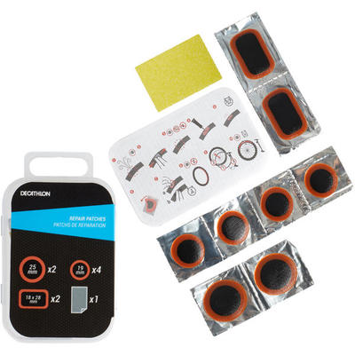 4 okrągłe łatki o średnicy 19 mm, 2 okrągłe łatki o średnicy 25 mm, 2 prostokątne łatki 18 mm x 28 mm, 1 drapaczka. Klej do łatek, niezbędny do ich przyklejenia i naprawy dętki (ref. 8545180) sprzedawany jest oddzielnie.