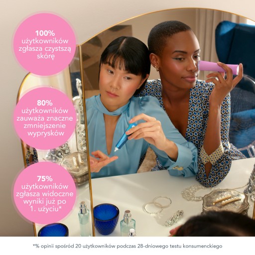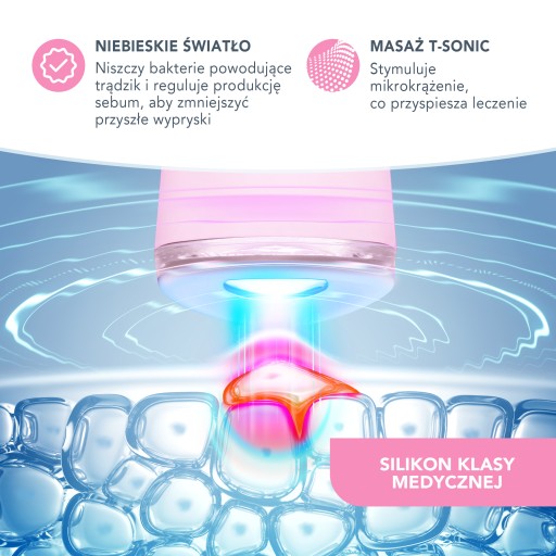 Niebieskie światło LED to nieinwazyjny procesory o długości fali świetlnej 415 nm do penetracji skóry. Zabijają bakterie, które powodują zanieczyszczenie, a następnie rozpuszczenie nowych wyprysków. Działanie pulsacyjne T-Sonic™ niszczy mikrokrążenie, ułatwia odnowę skóry w celu wyleczenia wyprysków i niszczenie blizn powstałych na skutek po niszczyach. Zwiększone wchłanianie kosmetyków, produkty przy zabiegach punktowych, takie jak żel ESPADA™ BHA+PHA Blemish Solution.