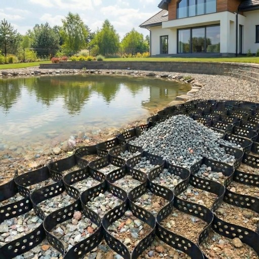 Nasza geokrata komórkowa (geosiatka komórkowa) świetnie sprawdza się jako zabezpieczenie cieków wodnych, stabilizując skarpy i chroniąc brzegi przed erozją. Jej trójwymiarowa struktura utrzymuje materiał w miejscu nawet przy zmiennych przepływach, dzięki czemu umocnienia pozostają trwałe i odporne na wypłukiwanie.