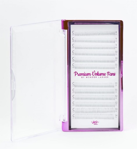 Rzęsy 3D Premium Volume Fans na paletce - ekskluzywne wachlarzyki do przedłużania rzęs metodami objętościowymi. Symetryczne, doskonałej jakości wachlarzyki rzęs o delikatnym zakończeniu, idealne do tworzenia puszystych aplikacji. Kępka zawiera 3 rzęsy grubości 0,07. Do wyboru stylistki należy profil oraz długość rzęs w kępce, która może się wahać od 8 mm do 14 mm. Smukła nóżka nawet po kontakcie z klejem jest delikatna co sprawia, że rzęsy doskonale sprawdzą się do metody objętościowej znacznie skracając czas wykonania aplikacji.