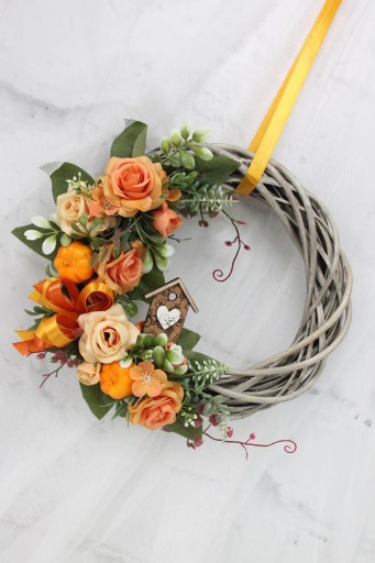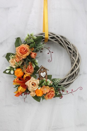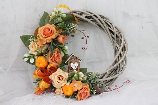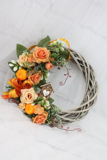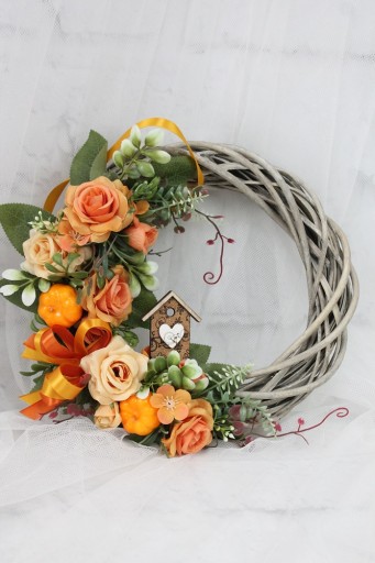 Jesienny wianek wiklinowy o średnicy 25cm udekorowany kwiatami jesiennej róży.