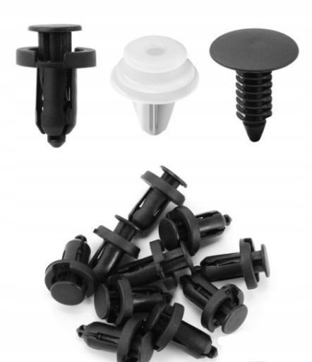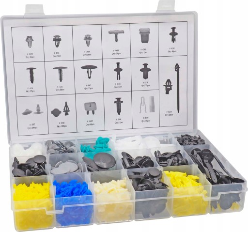 Uniwersalny zestaw 17 rodzajów spinek, klipsów, kołków, zatrzasków samochodowych do mocowania tapicerki w samochodzie, błotników, zderzaków, drzwi. W zestawie znajdują się standardowe rozmiary stosowane w większości samochodów osobowych i dostawczych takich jak: