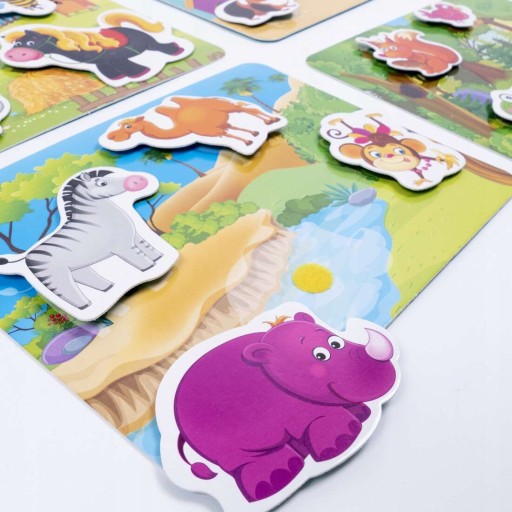 Przypatrz się uważnie planszom do gry, wszystkiego pomogą Ci się dowiedzieć! Przy pomocy rzepek umocuj każde zwierzątko do obrazka, który odpowiada miejscu jego zamieszkania. Przykładowo krówkę kierujemy do farmy, a wiewiórkę na drzewo. Ale to jeszcze nie wszystko. W każdym domku jest ulubione jedzonko zwierzątek. Dowiedz się, co uwielbiają pałaszować.